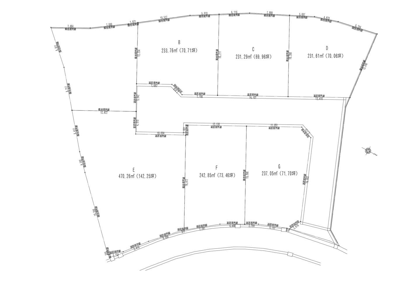 面積 | A区画:売却済 B区画:233.76㎡(70.71坪) C区画:231.29㎡(69.96坪) D区画:231.61㎡(70.06坪) E区画:470.26㎡(142.25坪) F区画:242.85㎡(73.46坪) G区画:237.05㎡(71.70坪) |