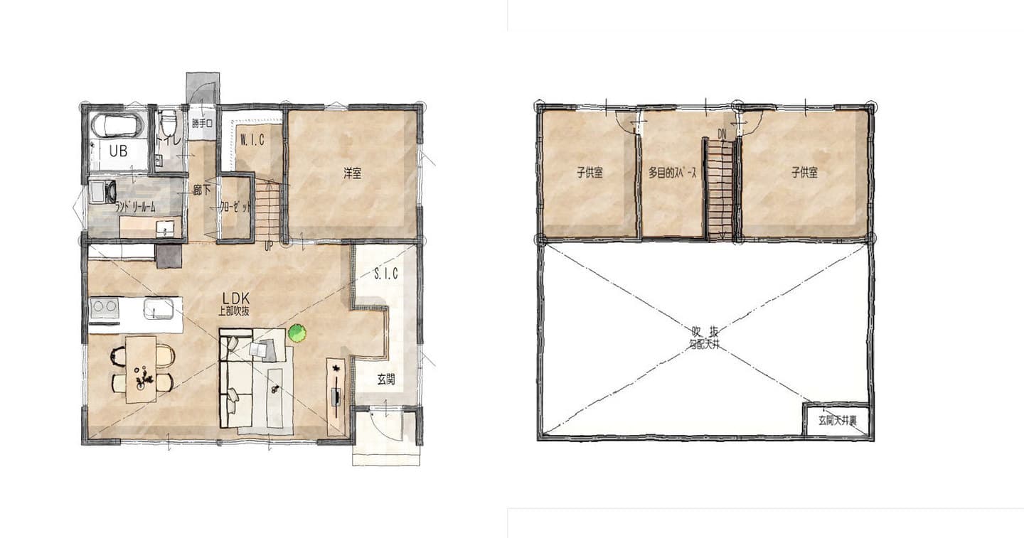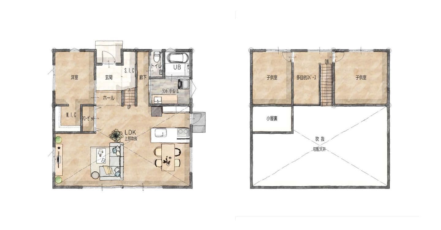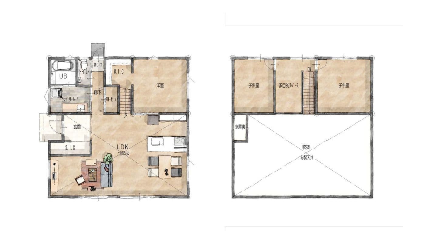 また、リビングだけでなく、2Fも勾配天井となり、無駄な空間をなくしています。