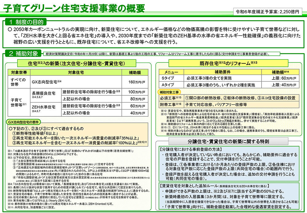 例年同様に、子育て世代に対して「長期優良住宅」や「ZEH水準住宅」に補助金が設定されていますが、今回は新しい制度として「GX志向型住宅補助金」が新設されました。