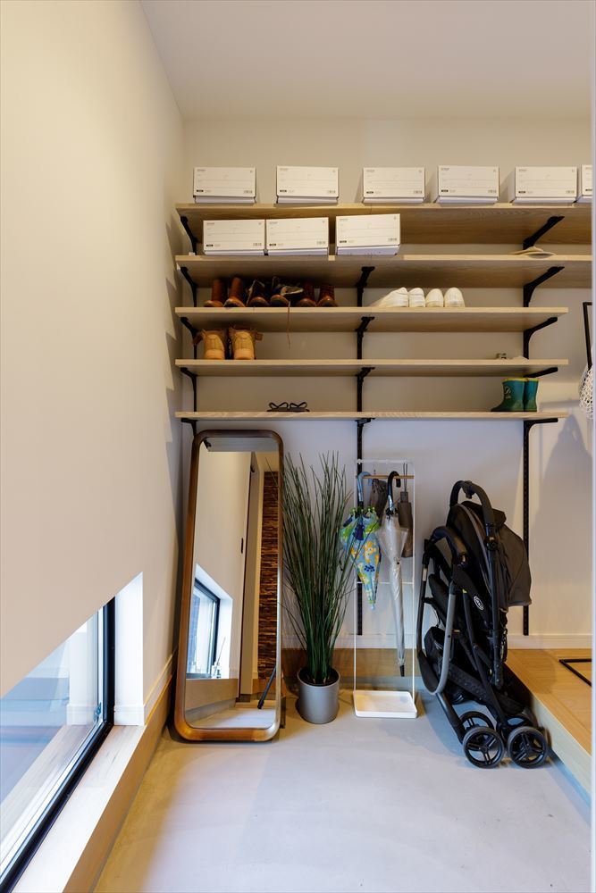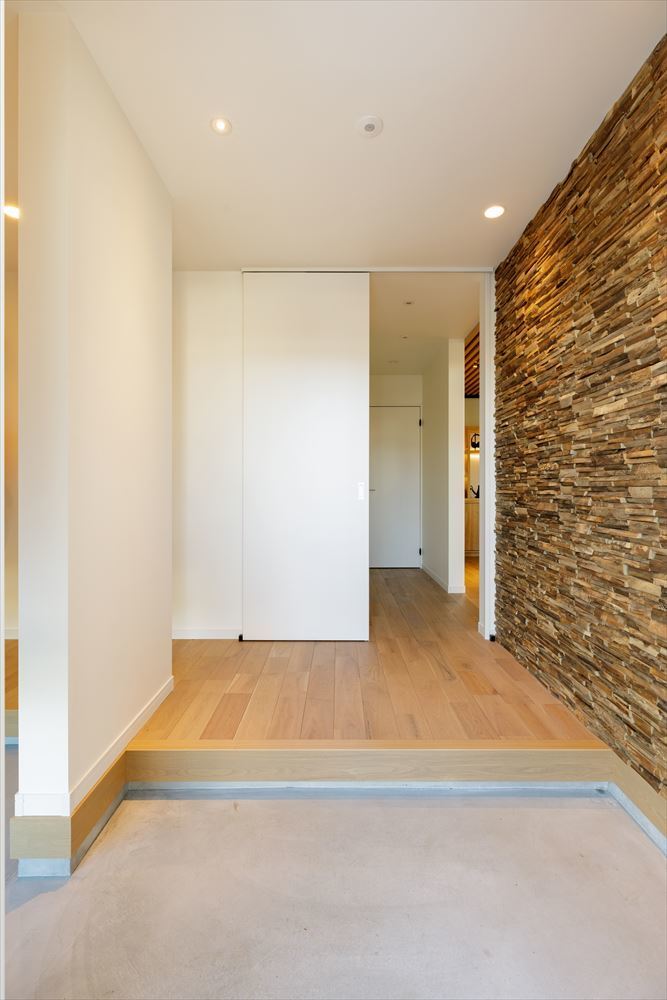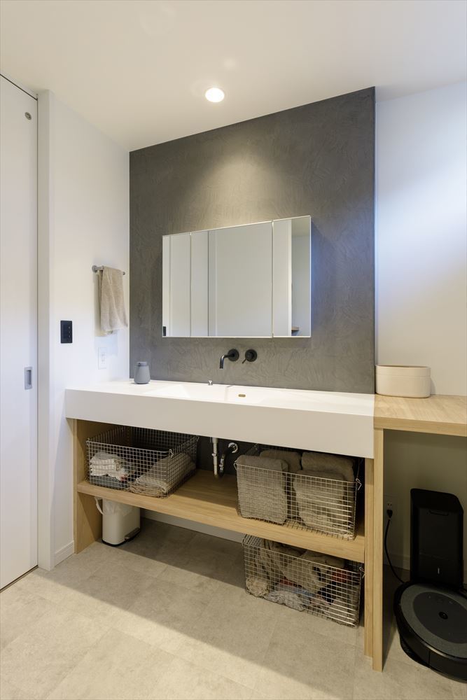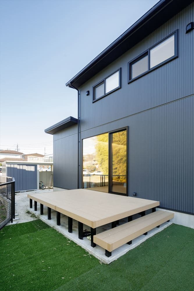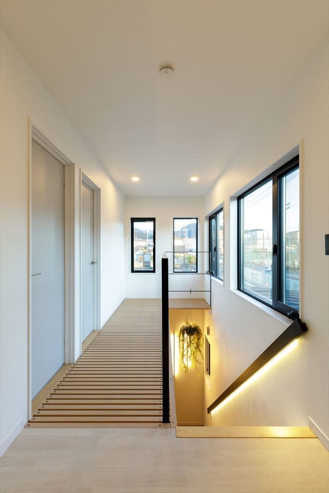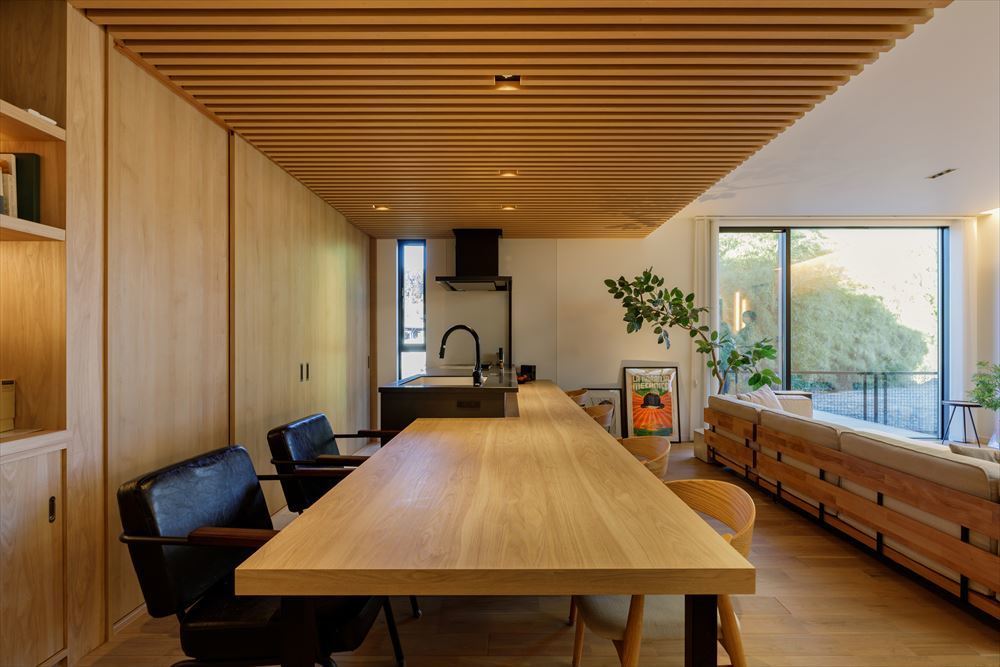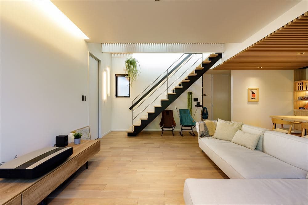 オープンなキッチン天井は無垢の木を並べたデザインで、壁面の収納は全てオリジナル設計の造作収納となっています。また、間接照明を採用していることで落ちつきのある、とてもおしゃれな空間となりました。その他にも、スケルトン階段やオーダーメイドの洗面台など、いたるところにお施主様のこだわりを叶えたお家となりました。