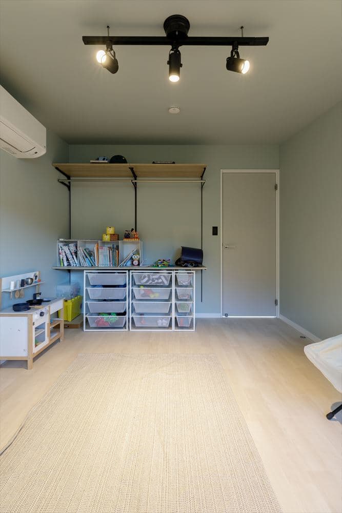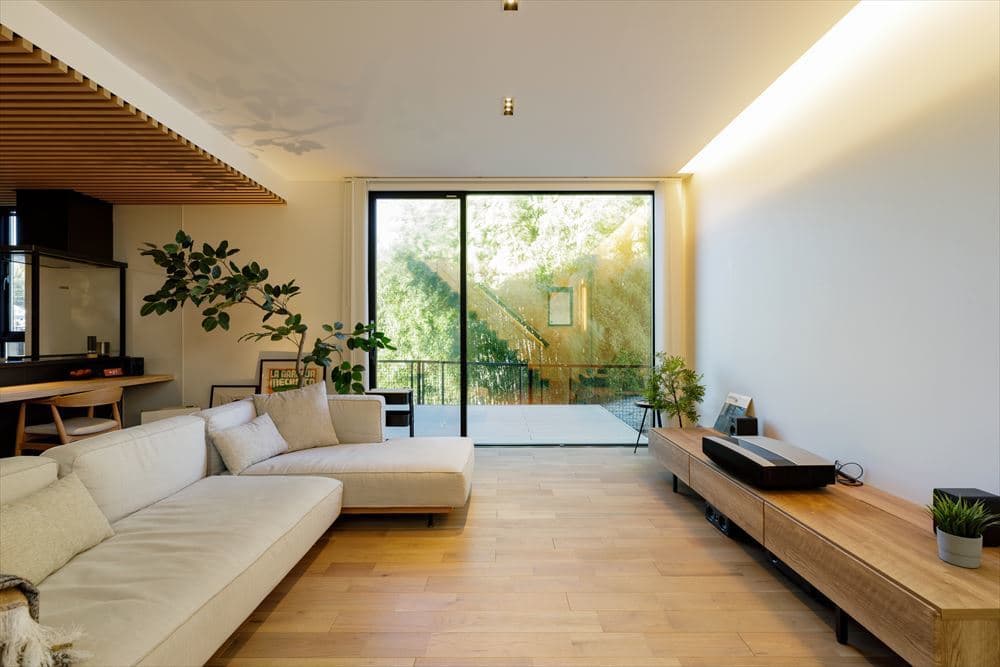 リビングの白い壁にはプロジェクターで映像を映して、シアタールームとして楽しめるようになっています。