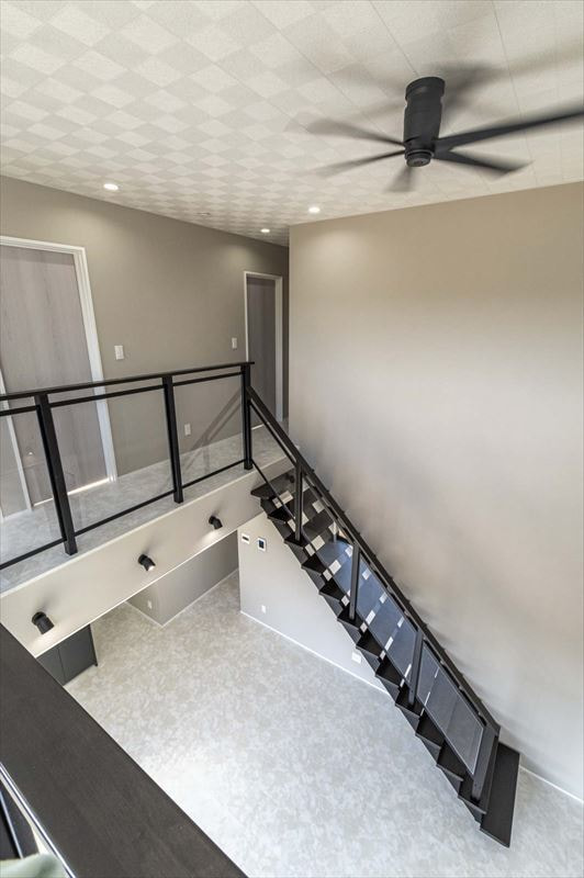 家族が集まるリビングは、SE構法の強みを生かして、大きな吹き抜けにスケルトン階段が映える、とても開放的な空間となっています。吹き抜けの窓から入る光で、冬でも暖かい明るいリビングです。