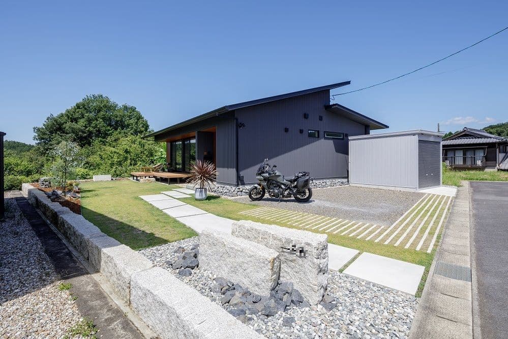 全体的に高さを抑えたフォルムで、レッドシダーを一部に貼った落ち着きのある外観の平屋です。