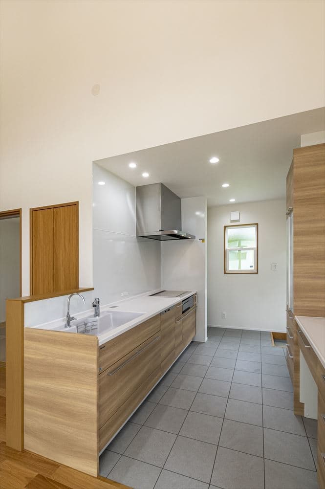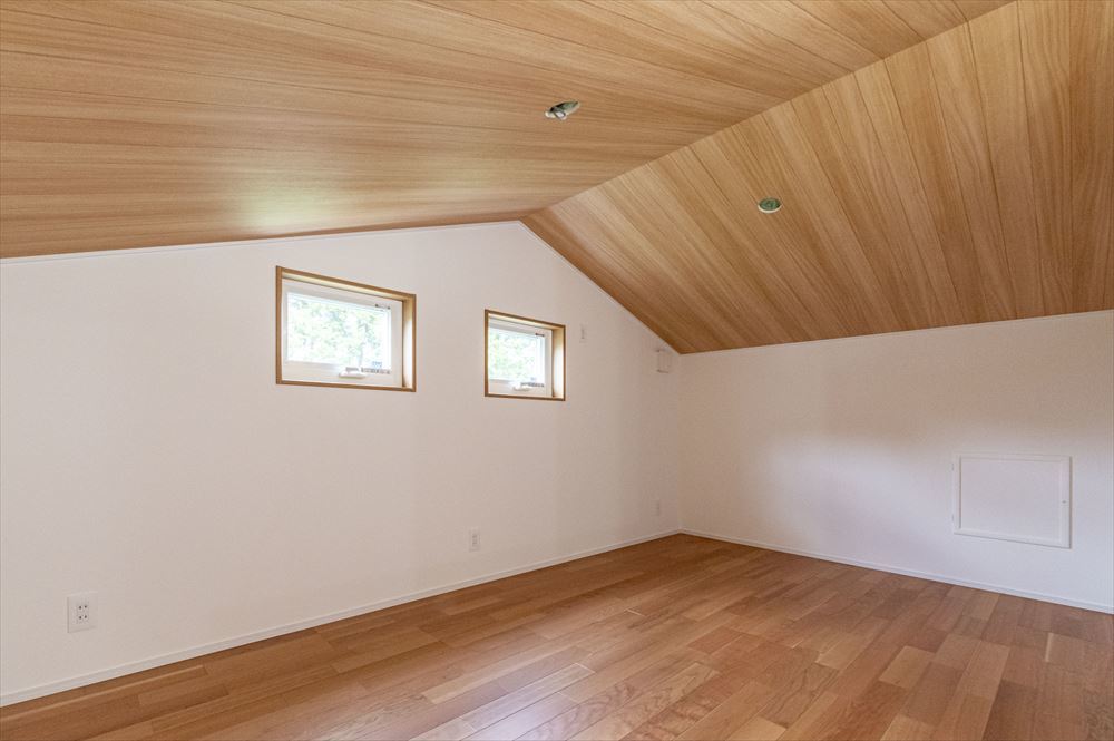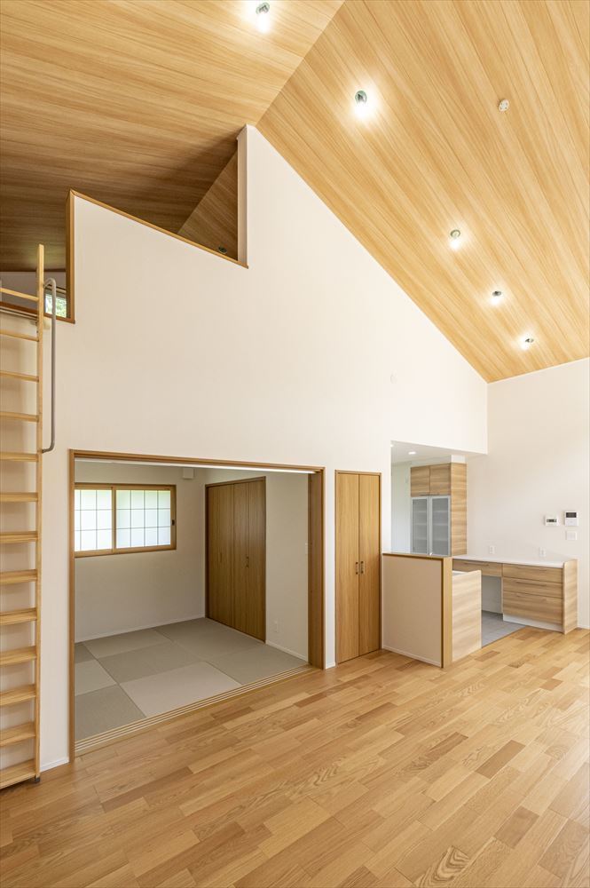 その明るいLDKは、SE構法の強みを生かした勾配天井となり、高さを感じるとても開放的な空間です。その高さを生かしたロフトスペースも家族の貴重な収納庫となっています。