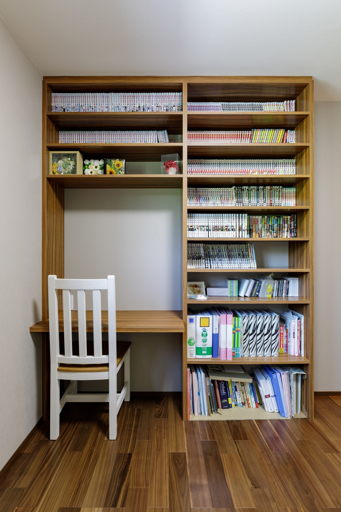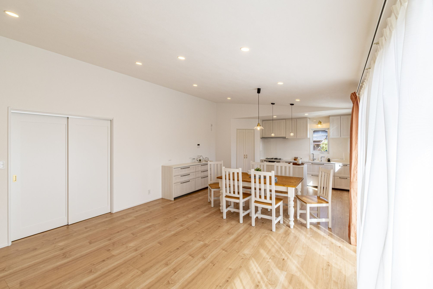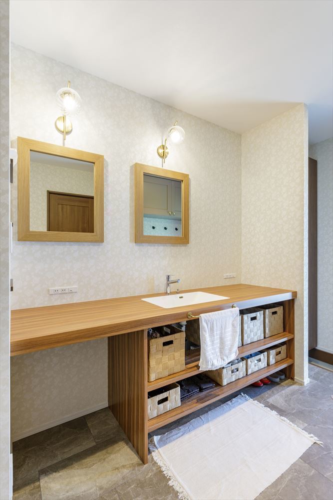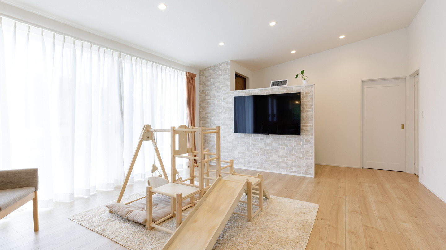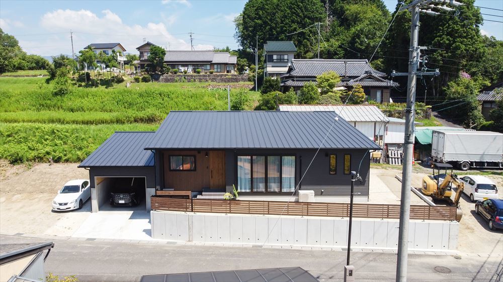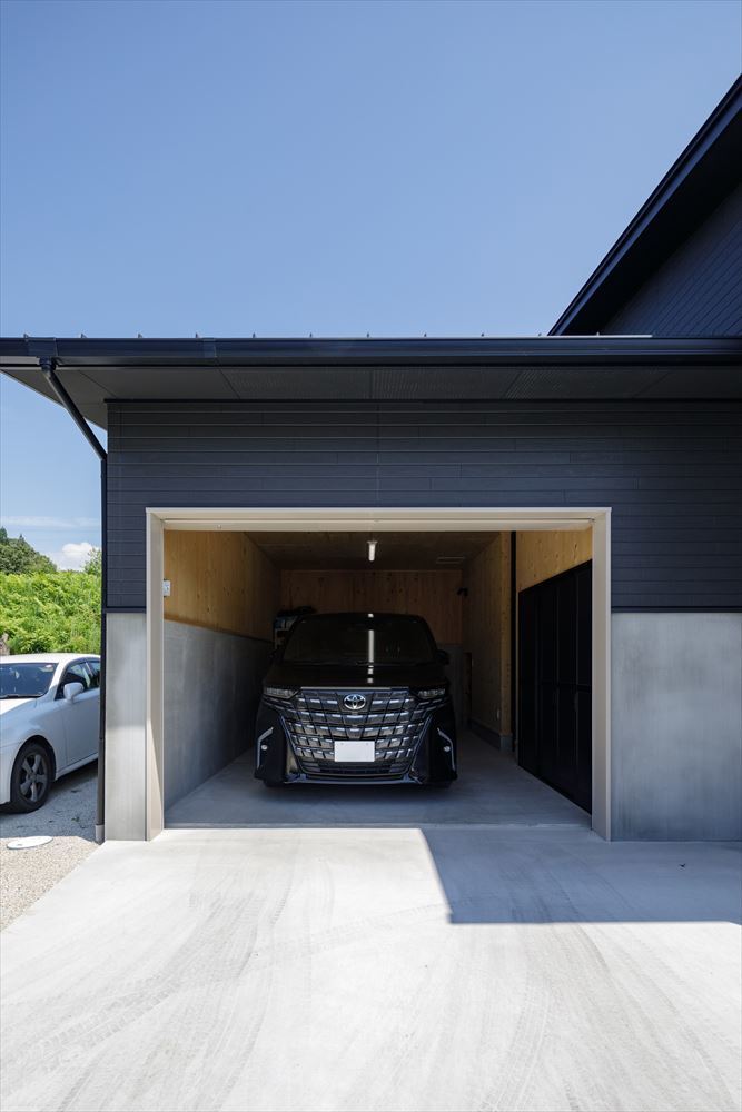 愛車を守るビルトンガレージを備えた平屋のガレージハウスです。愛車のメンテナンスからアウトドア用品の収納まで、ガレージの用途は多岐にわたります。ガレージからはトレーニングルームの直接つながる動線はご主人のこだわりでもあります。ご主人の趣味を楽しみながらも家族全員が快適に暮らせる平屋の家となっています。LDKはSE構法の強みを生かした勾配天井で大きな窓のある開放的な空間となっています。キッチンには作業台も設置してあり、ゆったりとした奥様も使いやすい間取りとなりました。他にも造作のデザインの洗面台や収納など造作家具類もオーダーメイドで設置しています。至るところにお施主様のこだわりがある素敵な住まいとなっています。性能的にも、SE構法で耐震等級3,断熱性能もUA値0.48、BEI値0.74のZEH基準の、日伸建設標準仕様の高性能な住宅となっていて、一年中、安心して快適な暮らしを実現しています。