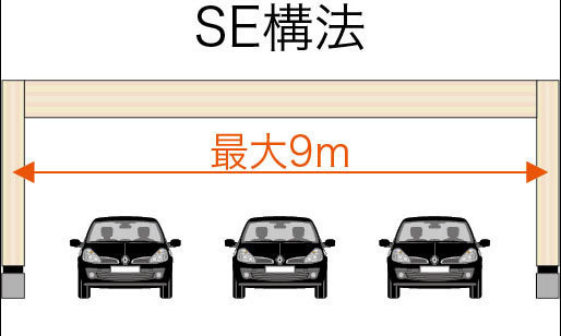 日伸建設で採用している「SE構法」であれば、耐力壁が少なくスパンを飛ばせることが可能となるので、耐震性を高めながらこのガレージ空間を実現することができるという訳です。