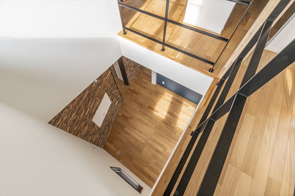 リビングはコンパクトながら吹き抜けとスチール手すりを採用し開放的に。